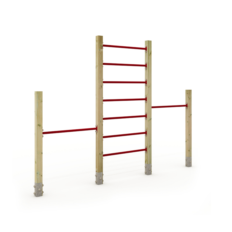 Tumble bar requires installation on sturdy hardwood posts (each post includes oversized ground anchors and screws). Complete hardware kit ensures stability. Material options include stainless steel or rust-proof iron crossbars.