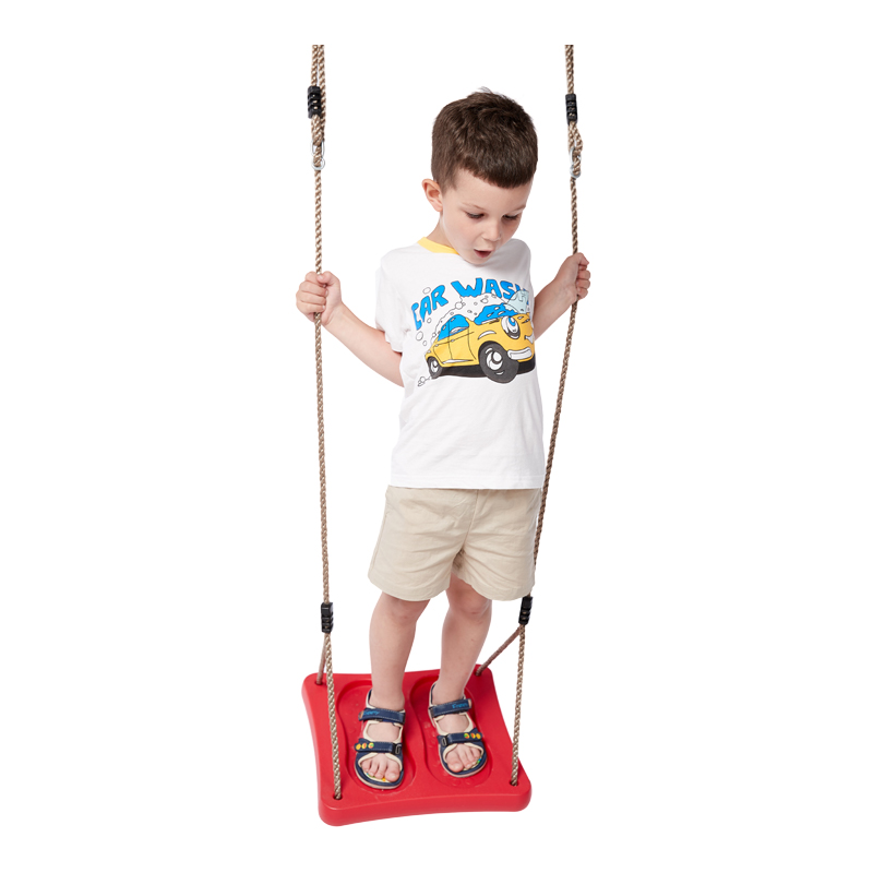 This standing swing features two molded footprints at the seat's center for precise weight distribution and safe swinging. Constructed with durable one-piece polyethylene (100 lb capacity), its non-slip footprints and vinyl-coated chains eliminate pinching risks.